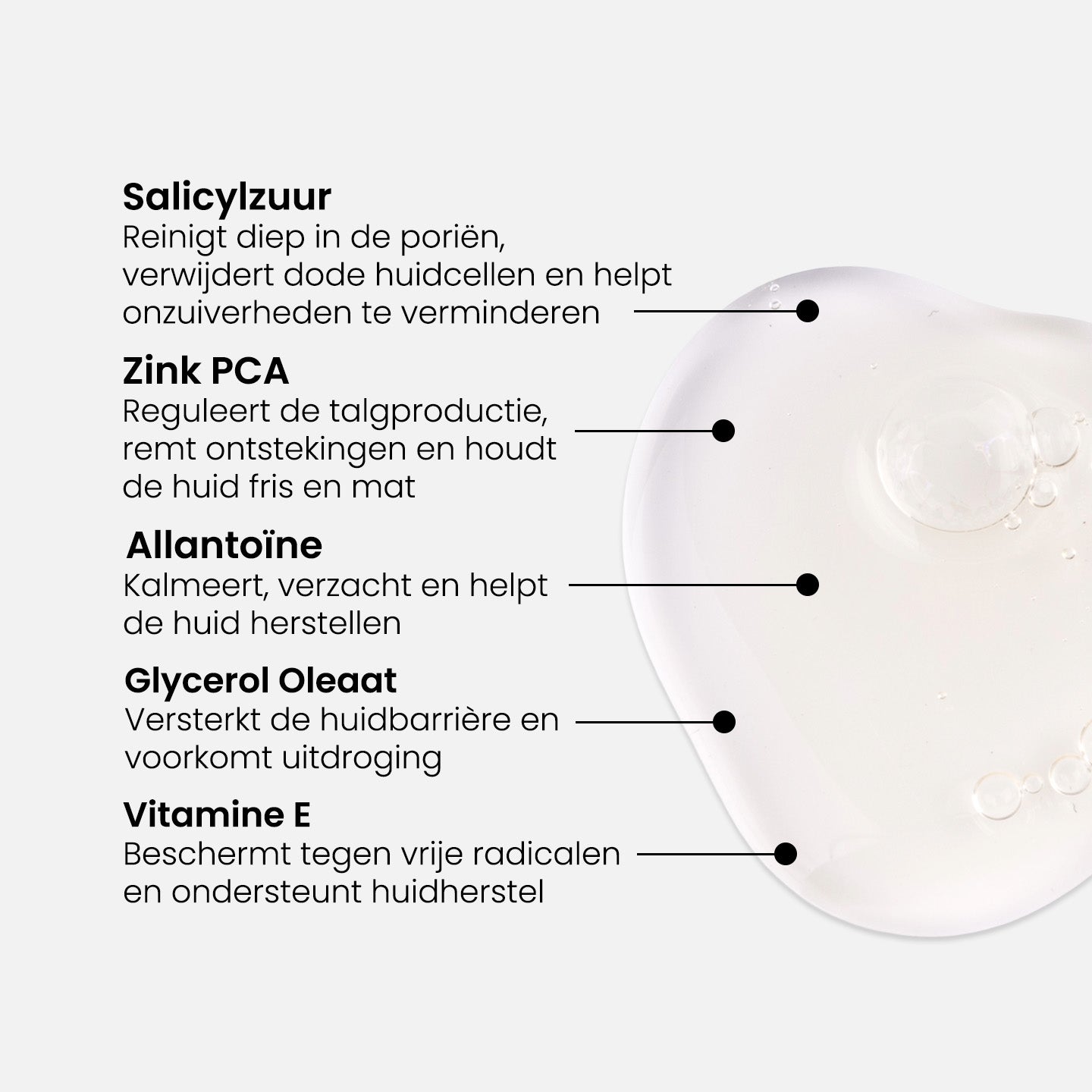 Salicylzuur is een beta-hydroxyzuur (BHA) dat bekendstaat om zijn zuiverende en ontstekingsremmende werking. In tegenstelling tot veel andere exfolianten is salicylzuur vetoplosbaar, waardoor het diep in de poriën kan doordringen. Het helpt opgehoopt talg, dode huidcellen en onzuiverheden los te maken en te verwijderen.