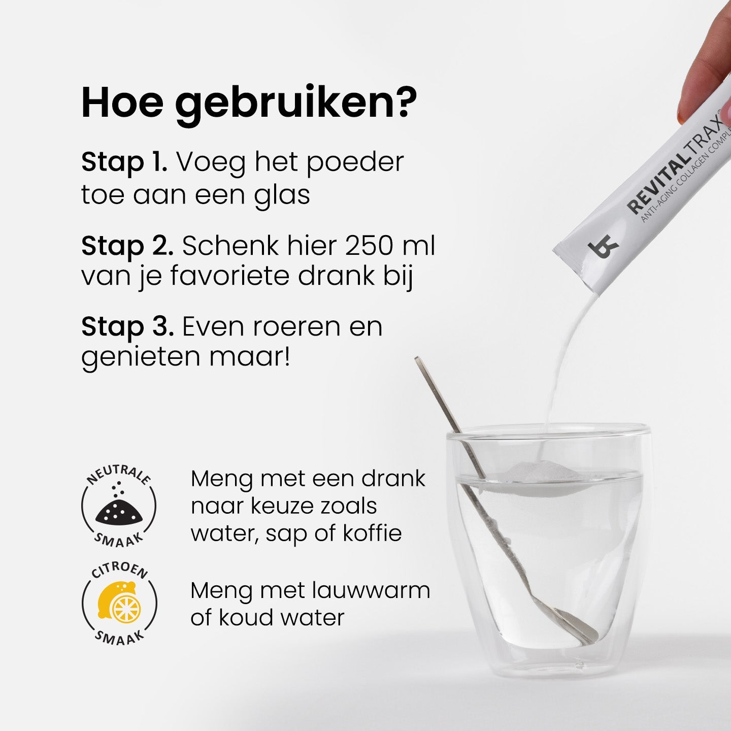 Het RevitalTrax Men’s Collagen Complex bevat 2,5 gram VERISOL® collageen, gecombineerd met een krachtige mix van vitamines en mineralen zoals magnesium, ijzer, selenium en vitamines C, D3 en B-complex (B3, B5, B7, B12).