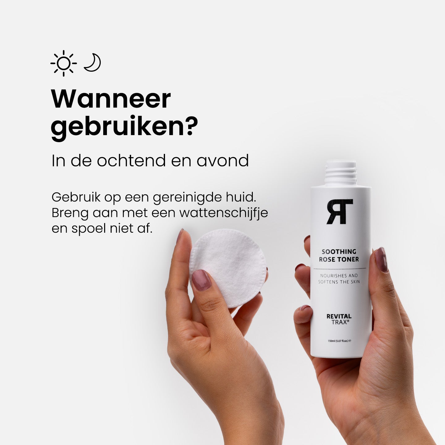 Gebruik de toner ’s ochtends en ’s avonds. Je kunt deze ook afwisselen met een andere toner van RevitalTrax, afhankelijk van de behoefte van je huid.