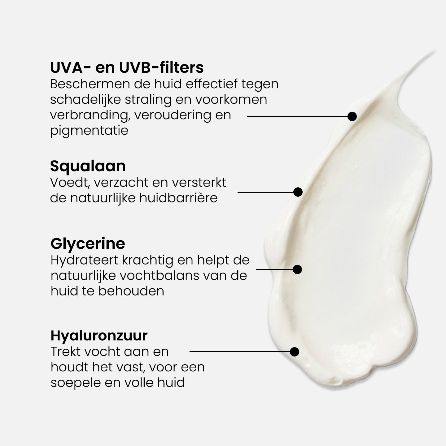 De Sun Protection Face Cream biedt bescherming tegen zowel UVB- als UVA-stralen, wat essentieel is voor het voorkomen van verbranding, pigmentatie, huidveroudering en het risico op huidkanker.
