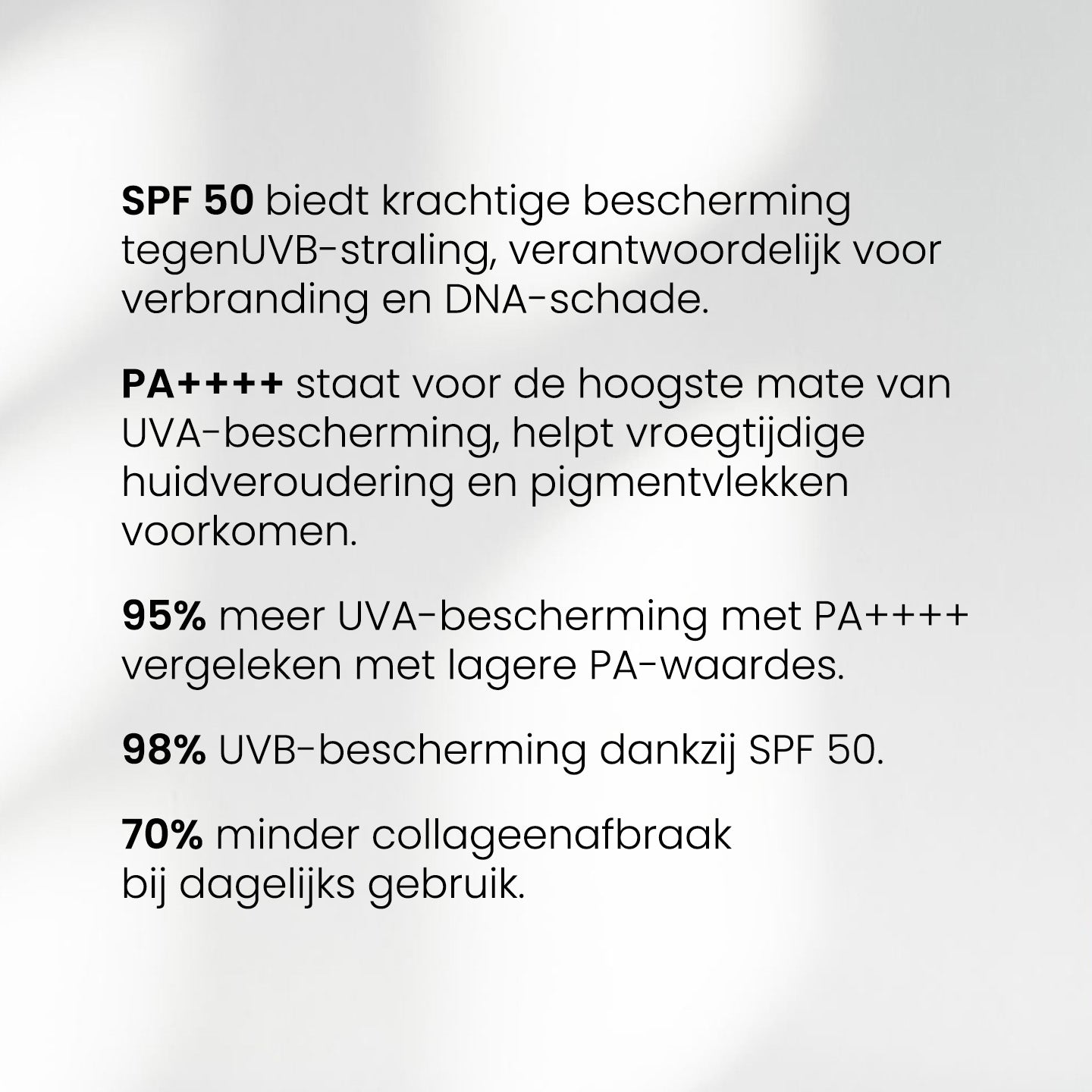 - Met SPF 50 wordt ongeveer 98% van UVB-straling geblokkeerd, waardoor je huid effectief wordt beschermd tegen zonnebrand en schadelijke effecten.